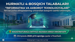 O‘zbekiston Respublikasi Oliy ta’lim, fan va innovatsiyalar vazirligining 2026-yil 23-fevraldagi 72-sonli buyrug‘iga muvofiq, 2025–2026-o‘quv yilida bakalavriat ta’lim yo‘nalishi bitiruvchi talabalari o‘rtasida “Informatika va axborot texnologiyalari” fani bo‘yicha olimpiadaning universitet bosqichi tashkil etilmoqda.