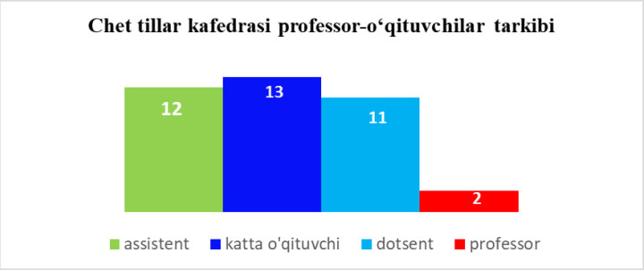 2013-yil 20-fevraldan 2018-yil 9-yanvargacha katta o‘qituvchi V.X. Gaziyeva faoliyat yuritgan. 2018-yil 11-yanvardan f.f.d.(DSc), professor A.A.Sharipova kafedra mudiri lavozimida ishlab kelmoqda. Kafedrada bakalavr ta’lim yo‘nalishining barcha yo‘nalishlarida (kunduzgi va sirtqi) ingliz, nemis, fransuz tillarida amaliy mashg‘ulotlar olib borilmoqda.