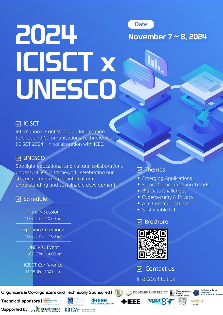 Darüber hinaus findet an der TUIT in Zusammenarbeit mit dem Institut für Elektro- und Elektronikingenieure (IEEE) organisierte „Internationale Konferenz für Informationswissenschaft und Kommunikationstechnologien: Anwendungen, Trends und Möglichkeiten – ICISCT 2024“ dieses Jahr zum ersten Mal an der südkoreanischen Kookmin-Universität statt.