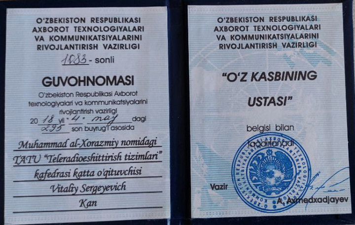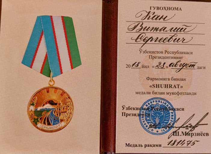 Voor zijn jarenlange toegewijde dienst is Vitaliy Sergeevich Kan door de regering van Oezbekistan onderscheiden met de "Shuhrat"-medaille en door het ministerie van Digitale Technologieën met de titel "Meester in zijn vak".