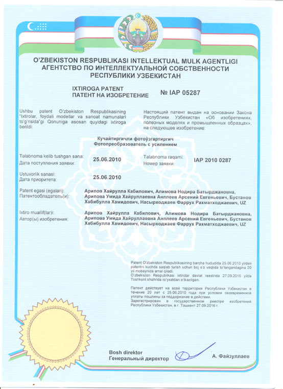 In 2010 ontving hoofddocent UX Aripova een patent (nr. IAP 2010 0287) van het Agentschap voor Intellectuele Eigendom van de Republiek Oezbekistan voor de uitvinding getiteld "Versterkte foto-elektrische omvormer".