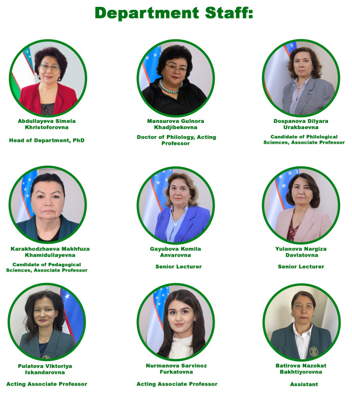 Currently, the department is headed by the 2 associate professors, and resided by 3 senior teachers, and 3 trainee teachers. The teachers of the department cooperate with the Institute of Language and Literature of the Academy of Sciences of the Republic of Uzbekistan, National University of Uzbekistan, the Uzbek State University of World Languages, and the Tashkent Institute of Higher Pedagogy.