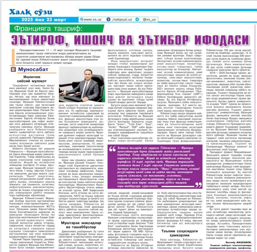 On March 23, issue 59 (8954) of "Xalq So‘zi" newspaper published an article titled " Recognition, Trust, and Attention ", written by B. Makhkamov, Rector of Tashkent University of Information Technologies named after Muhammad al-Khwarizmi.