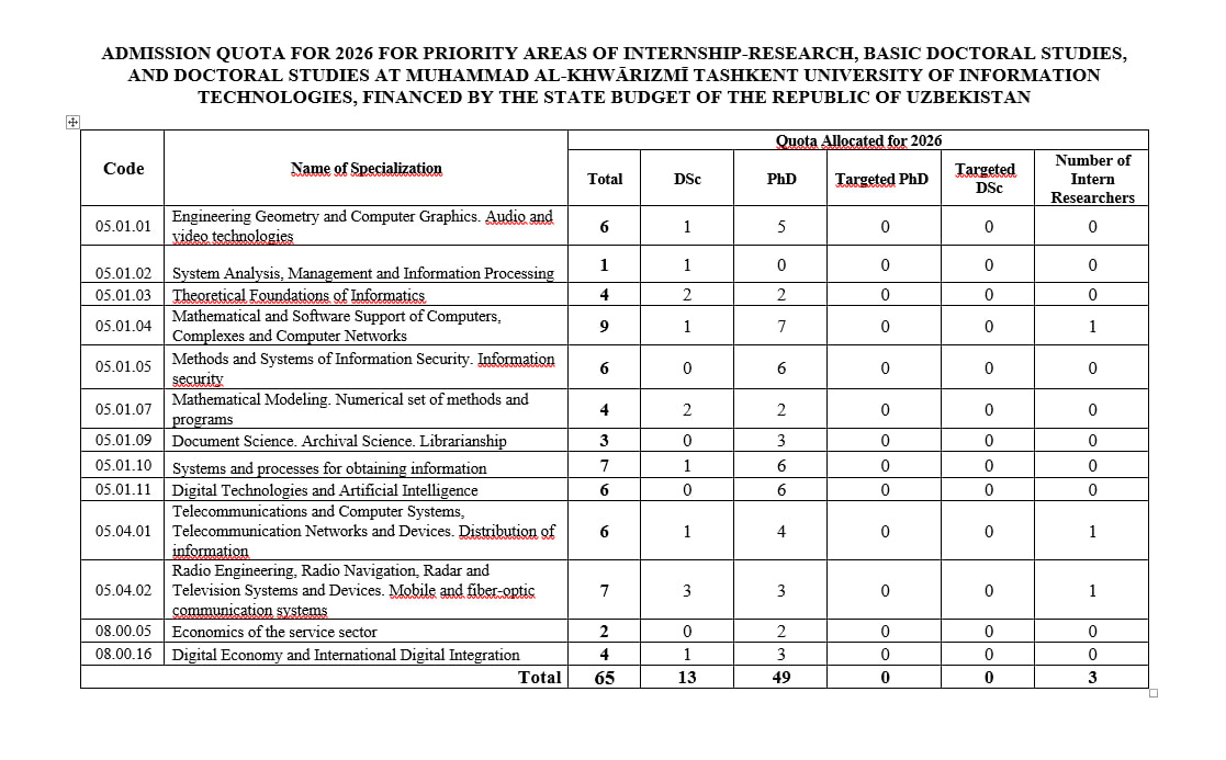 ADMISSION QUOTA FOR 2026 FOR PRIORITY AREAS OF INTERNSHIP-RESEARCH, BASIC DOCTORAL STUDIES, AND DOCTORAL STUDIES AT MUHAMMAD AL-KHWĀRIZMĪ TASHKENT UNIVERSITY OF INFORMATION TECHNOLOGIES, FINANCED BY THE STATE BUDGET OF THE REPUBLIC OF UZBEKISTAN