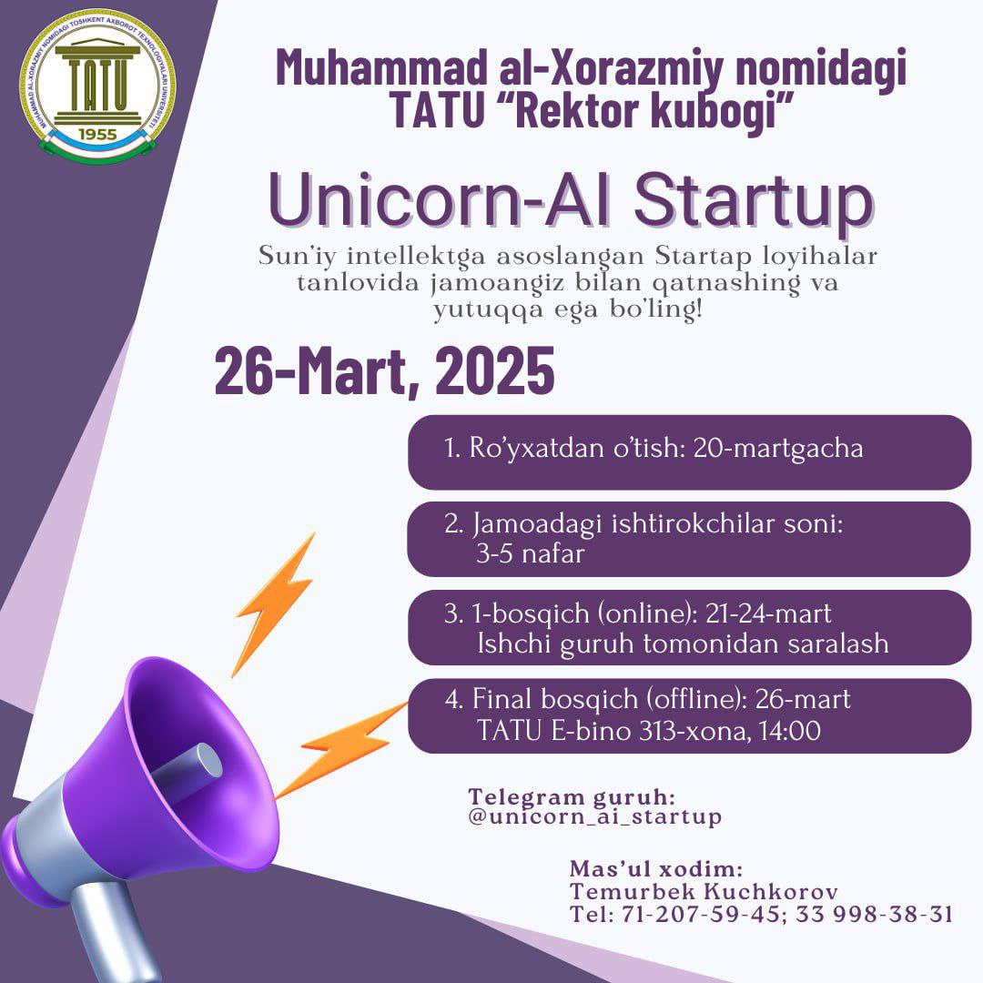 For questions, contact the administrator: t.kuchkorov@tuit.uz or @unicorn_ai_startup