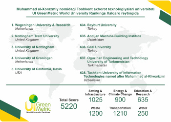Tashkent University of Information Technologies named after Muhammad al-Khwarizmi took the 638th place among TOP universities in the UI Green Metric World University Rankings.