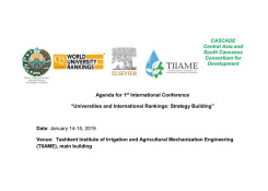 The Ministry of Higher and Secondary Specialized Education of the Republic of Uzbekistan (MHSSE), QS University Rankings (QS), Elsevier, Tashkent Institute of Irrigation and Agricultural Mechanization Engineers (CIIIMSH), Central Asian and South Caucasus Consortium of Agricultural Universities for Development (CASCADE) organize the First International conference "Universities and international ratings: formation of a strategy."