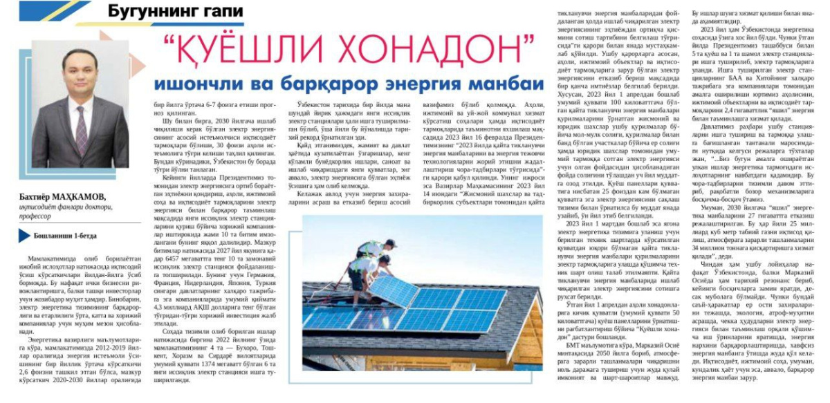 B.Maxkamovning "Quyoshli xonadon" ishonchli va barqaror energiya manbai nomli maqolasi chop etildi.