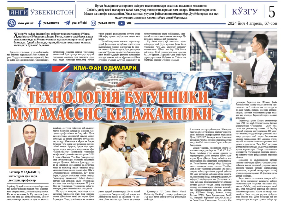 📰 Bugun, 2024-yil 4-aprel kuni Yangi O‘zbekiston gazetasining 67 (1128) - sonida Muhammad al-Xorazmiy nomidagi Toshkent axborot texnologiyalari universiteti rektori B.Maxkamovning "Texnologiya bugunniki, mutaxassis kelajakniki" nomli maqolasi chop etildi.