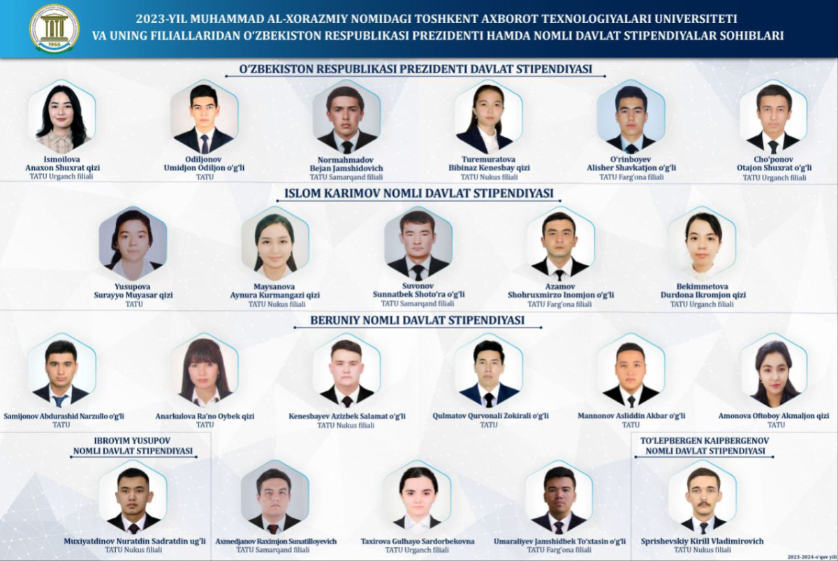 2023-2024-o‘quv yilida Muhammad al-Xorazmiy nomidagi Toshkent axborot texnologiyalari universiteti va uning hududiy filiallaridan bakalavriat yo‘nalishida 22 nafar talaba O‘zbekiston Respublikasi Prezidenti davlat stipendiyasi, Beruniy, Islom Karimov, To‘lepbergen Kaipbergenov hamda Ibroyim Yusupov nomli davlat stipendiyalarini qo‘lga kiritishdi.