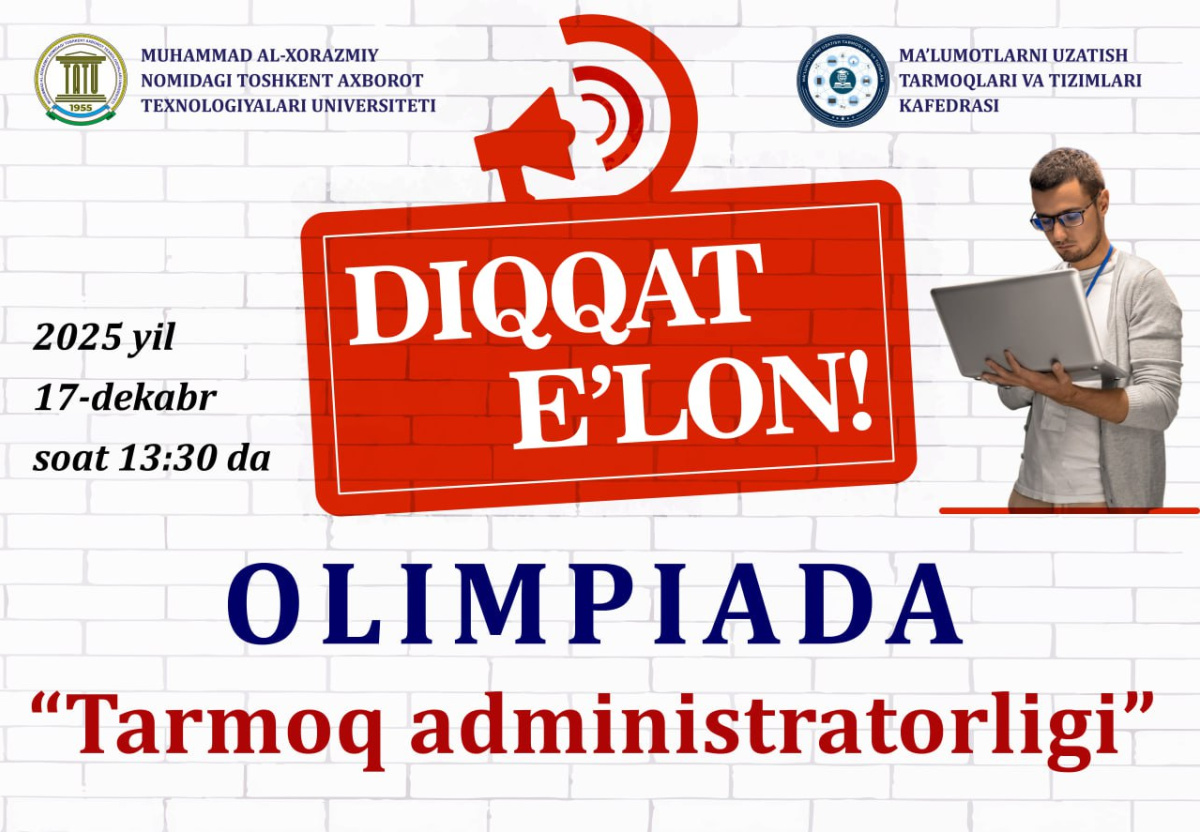 🗓 2025 yil 17-dekabr, soat 13:30 da Telekommunikatsiya texnologiyalari fakulteti talabalari uchun “Ma’lumotlar uzatish tarmoqlari va tizimlari” kafedrasi tomonidan “Tarmoq administratorligi” yo‘nalishi bo‘yicha olimpiada tashkil etiladi.