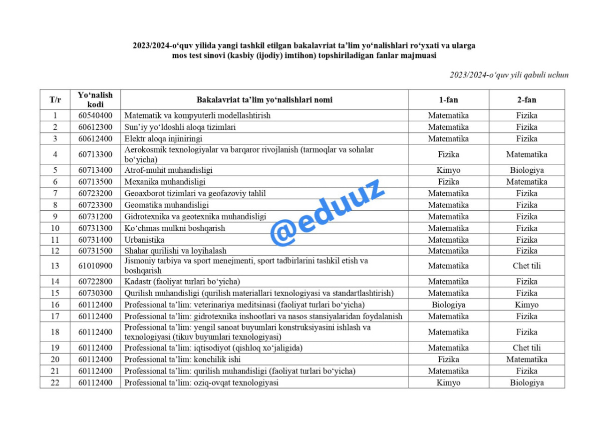 2023/2024-o‘quv yilida YANGI TASHKIL ETILGAN BAKALAVRIAT TA’LIM YO‘NALISHLARI ro‘yxati va ularga mos test sinovi (kasbiy/ijodiy imtihon) topshiriladigan FANLAR MAJMUASI