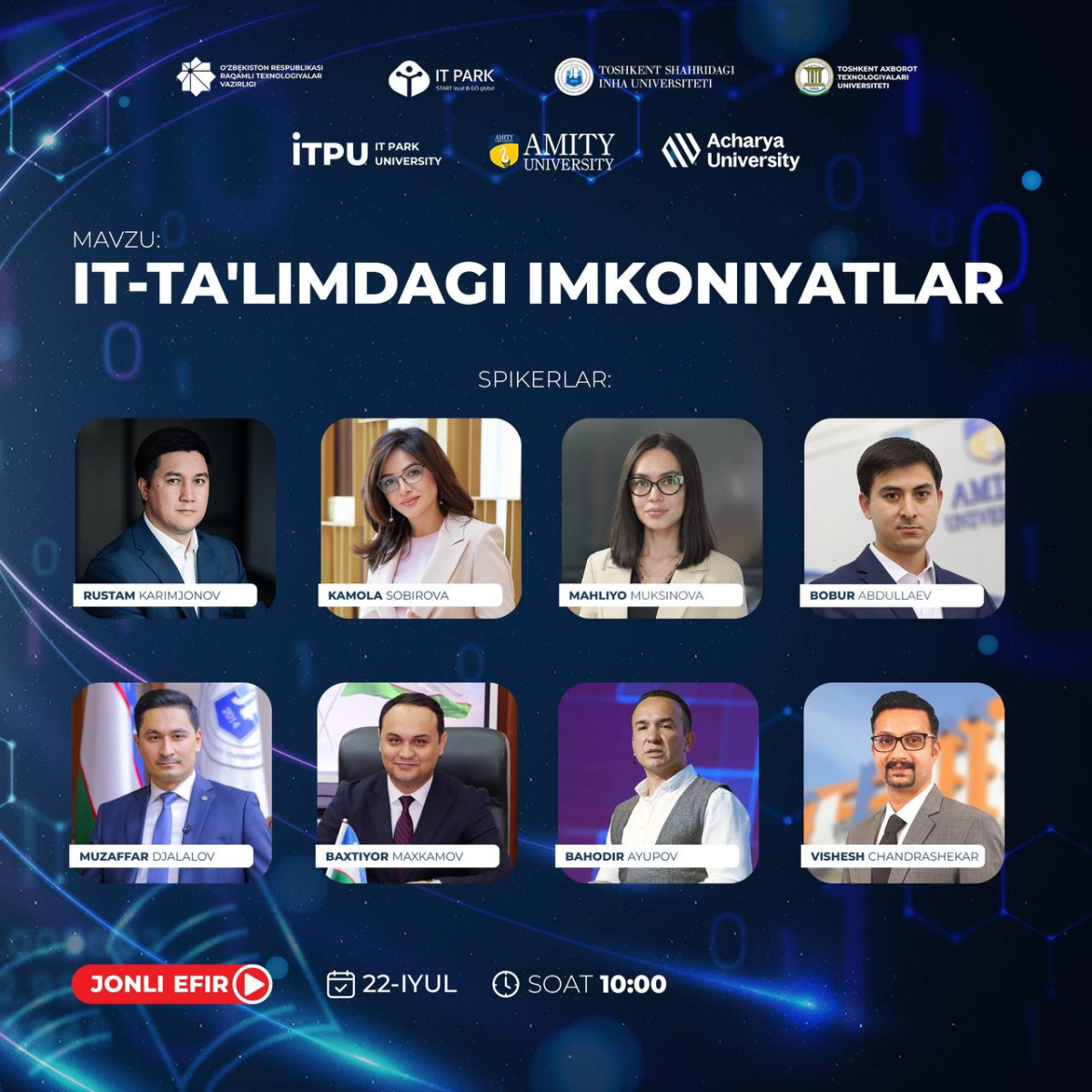 Jonli efirda Raqamli texnologiyalar vaziri o‘rinbosari Rustam Karimjonov, vazir maslahatchisi Kamola Sobirova, IT Park bosh direktorining raqamli ta’limni rivojlantirish bo‘yicha o‘rinbosari Mahliyo Muksinova, TATU, Inha, Amiti, IT-Park universitetlari rektorlari va Acharya universiteti direktori ishtirok etadi.