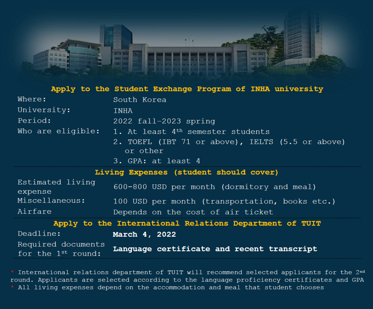 Agar siz a'lo baholarga o'qiyotgan va Ingliz tilini bilish sertifikatiga ega bo'lsangiz, u holda sizda Janubiy Koreyaning INHA universitetida almashinuv dasturida ishtirok etish imkoniyati mavjud.