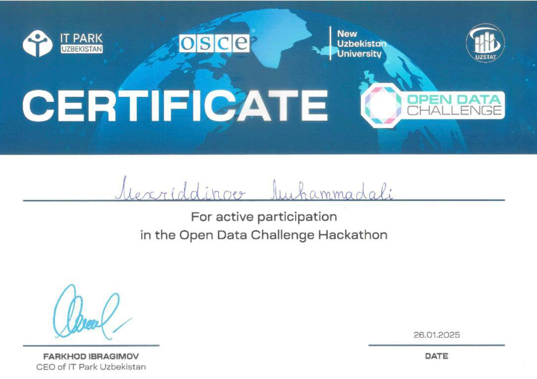 🤔 Hakatonda “Dasturiy injiniring” fakulteti talabasi Mexriddinov Muhammadali Ortiq o‘g‘li “Kidney Guard” loyihasi bilan faol ishtirok etib sertifikat bilan taqdirlandi.