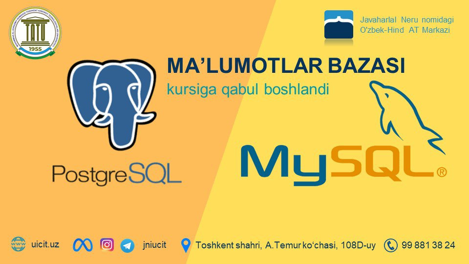 🔊 Markazimizda “Oracle Academy” tomonidan taqdim etiluvchi "Maʼlumotlar bazasi (MySQL, PostgreSQL)" kursiga sizni taklif qilamiz.