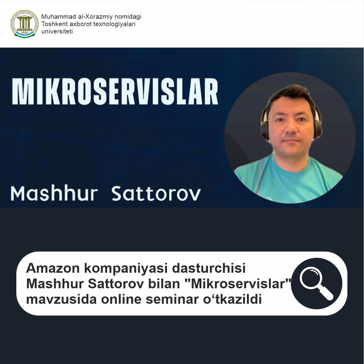 Joriy yilning 18-mart kuni Muhammad al-Xorazmiy nomidagi Toshkent axborot texnologiyalari universitetida Amazon kompaniyasi dasturchisi Mashhur Sattorov bilan "Mikroservislar" mavzusida online seminar o‘tkazildi