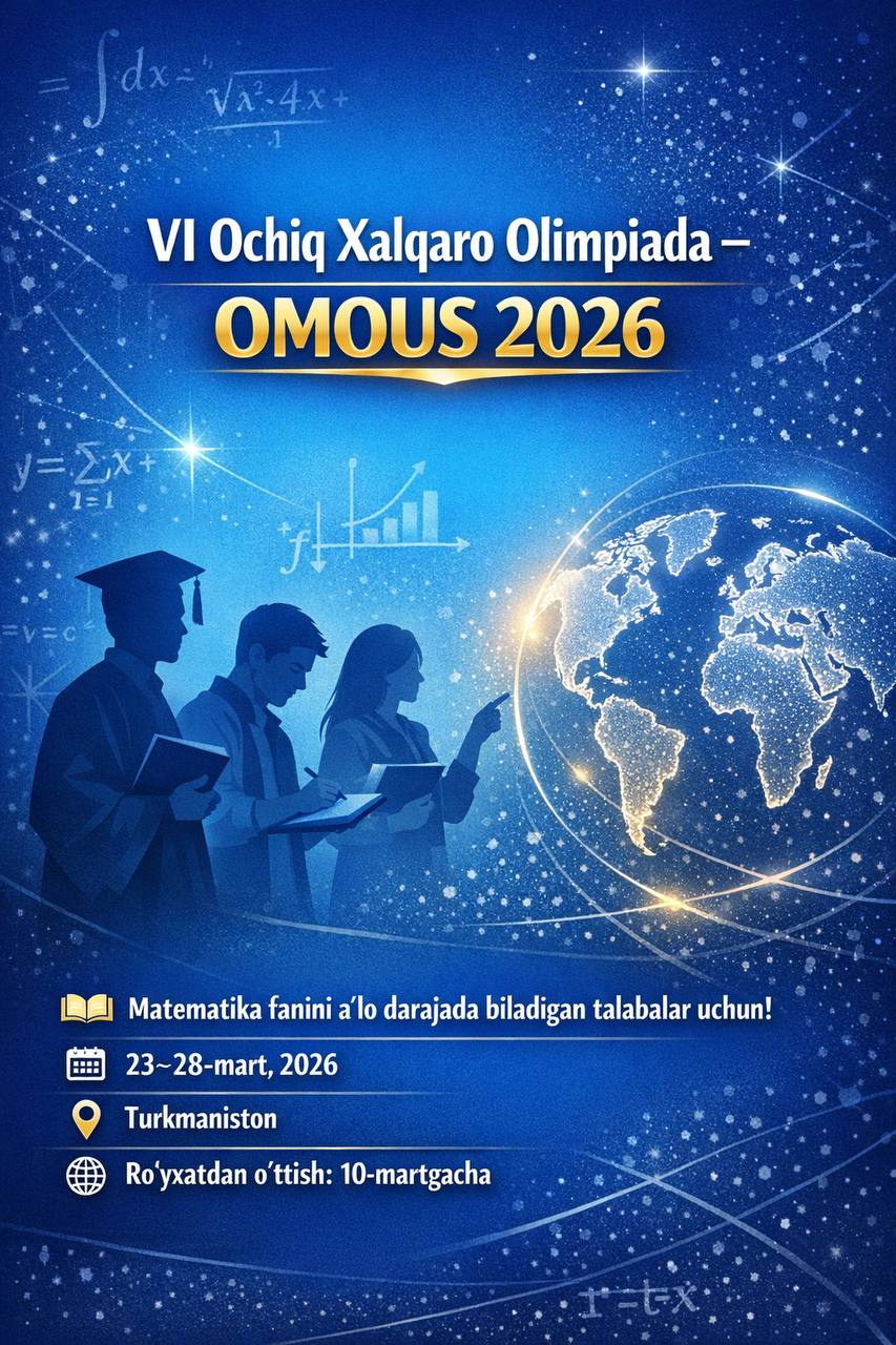 Turkmaniston ta’lim vazirligi hamda Xalqaro gumanitar fanlar va taraqqiyot universiteti murojaatiga asosan, 2026-yil 23–28-mart kunlari Turkmanistonda matematika fani bo‘yicha VI Ochiq Xalqaro Olimpiada (OMOUS-2026) bo‘lib o‘tadi.