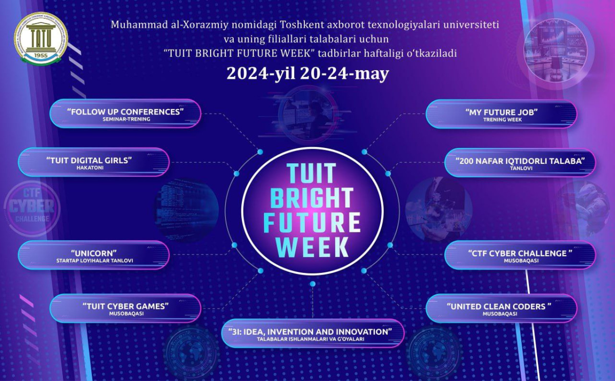 💻 2024-yilning 20-24-may kunlari “TUIT bright future week” haftaligi bo‘lib o‘tadi. Unda talabalar turli musobaqalar, hakatonlar, tanlovlar, ko‘rgazma va albatta ko‘ngilochar dasturlarda ishtirok etishlari rejalashtirilgan.