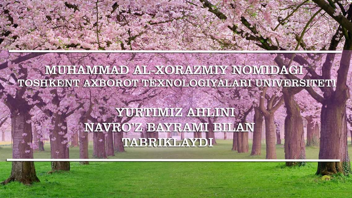 Искренне поздравляем всех преподавателей, студентов Ташкентского университета информационных технологий имени Мухаммада ал-Xоразмий, а также весь народ Узбекистана с праздником весны и обновления природы – Наврузом! Пусть в этом году сбудутся все Ваши мечты! Пусть на нашей земле всегда царят мир и спокойствие!