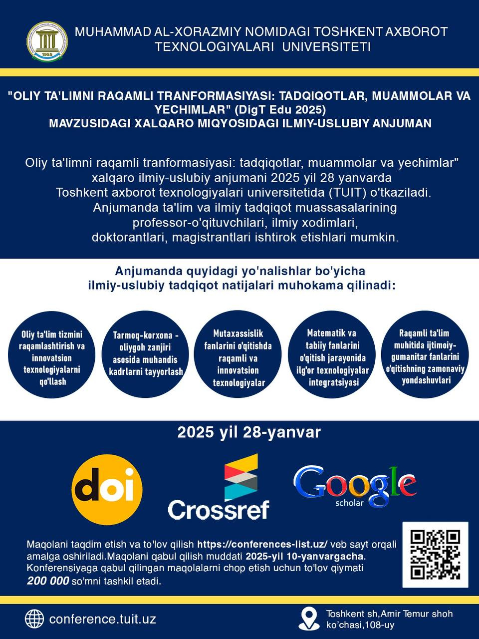 2025-yilning 28-yanvar kuni Muhammad al-Xorazmiy nomidagi Toshkent axborot texnologiyalari universitetida online va offline formatda konferensiya bo‘lib o‘tadi.
