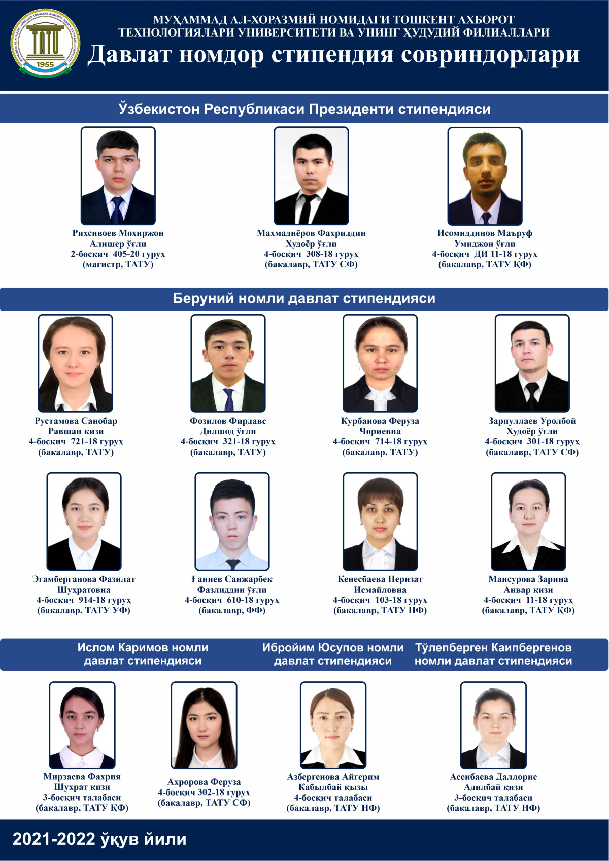 Муҳаммад ал-Хоразмий номидаги Тошкент ахборот технологиялари университети ва унинг филиалларидан Ўзбекистон Республикаси Президенти ҳамда Давлат номдор стипендияларига тавсия этилтганлар МАЪЛУМОТи