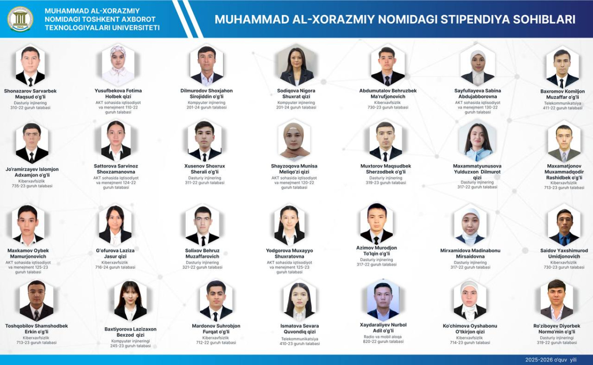 🎉“Muhammad al-Xorazmiy nomidagi stipendiya”ga sazovor bo‘lgan barcha talabalarni samimiy tabriklaymiz va ularning yutuqlari doimo ortib borishini tilaymiz!