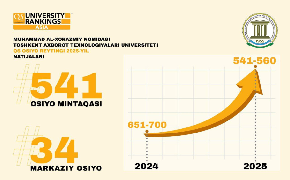 Bugun, 6-noyabr kuni, nufuzli xalqaro QS reyting tashkiloti Osiyo Universitetlarining 2025-yil uchun (QS Asia University Rankings - 2025 (https://www.topuniversities.com/asia-university-rankings)) reyting natijalarini e’lon qildi. Unda Muhammad al-Xorazmiy nomidagi Toshkent axborot texnologiyalari universiteti yuqori natija ko‘rsatib, mintaqadagi yetakchi universitetlardan biriga aylandi.
