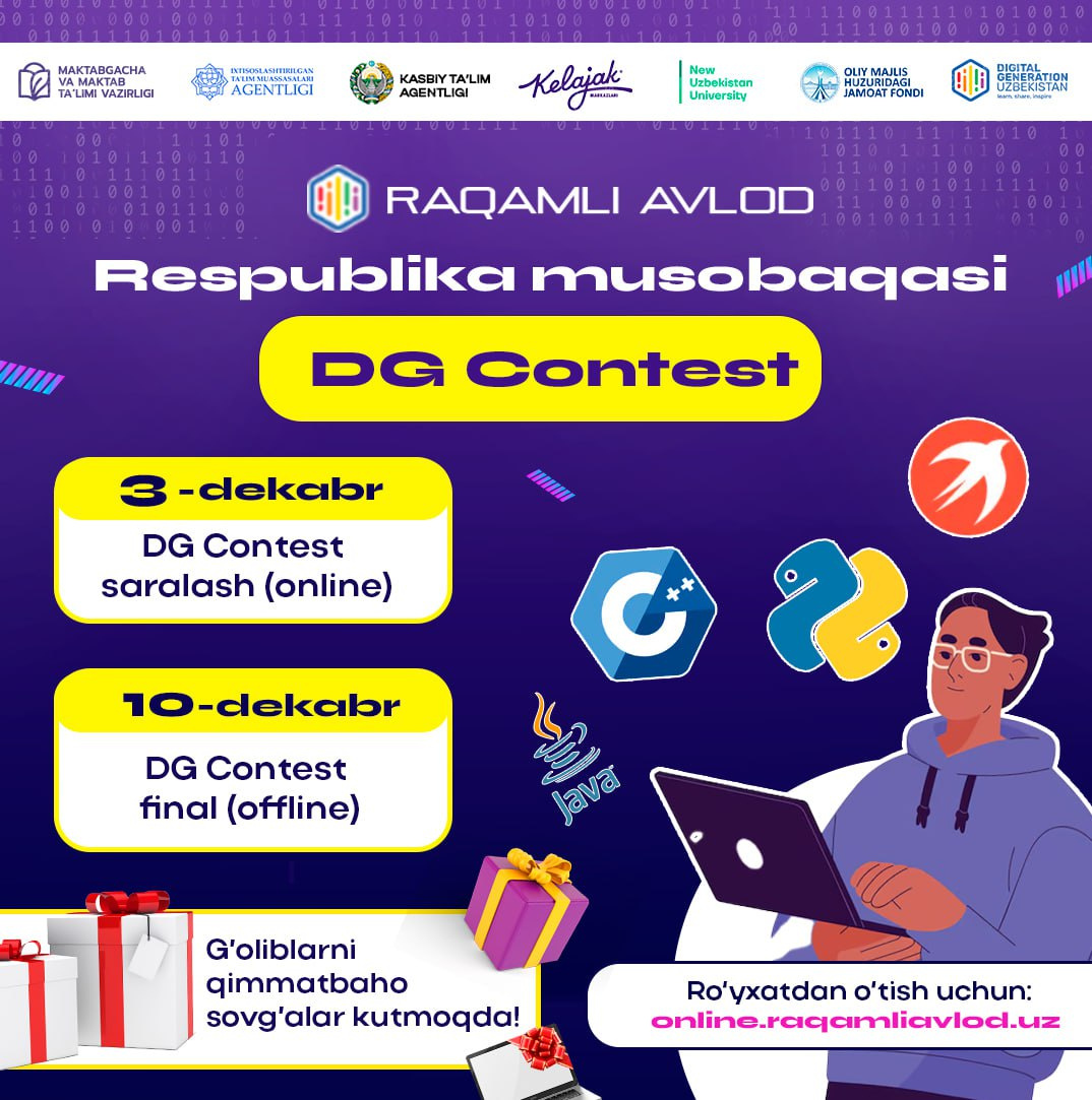 💻 DG Contest – dasturlash bo‘yicha onlayn/offlayn musobaqalarda qatnashib, o‘z bilimingizni sinab ko‘ring.