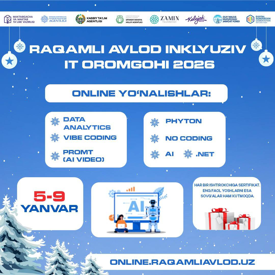 Yangi yilni texnologiyalar olamida boshlang! Loyiha 2026-yil 5–9-yanvar kunlari onlayn formatda bo‘lib o‘tadi.