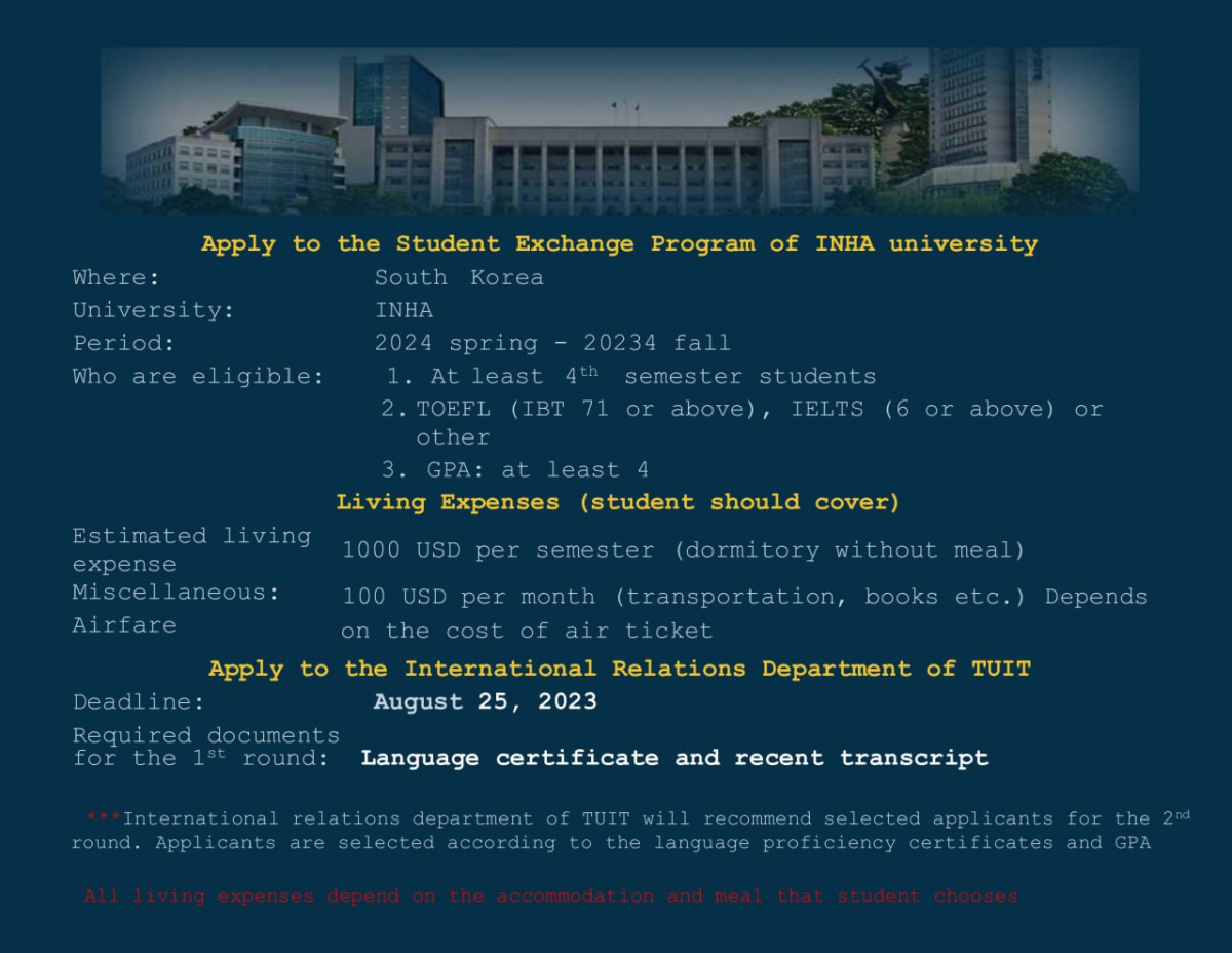 Almashinuv dasturi Janubiy Koreyaning Inha universitetida 2024-yil bahorgi semestr davomida o‘tkazilishi rejalashtirilgan.