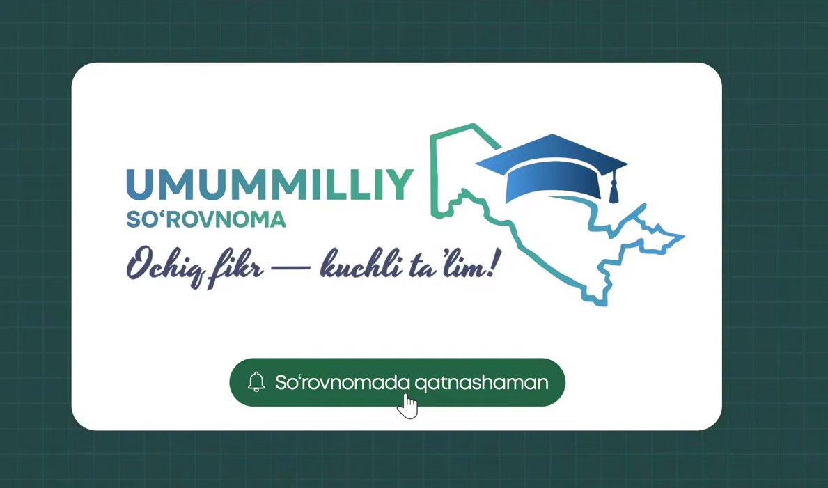 ✅ Talaba va professor-oʻqituvchilardan ushbu soʻrovnomada faol qatnashish va taʼlim sifati uchun ochiq fikr bildirishlarini soʻrab qolamiz.