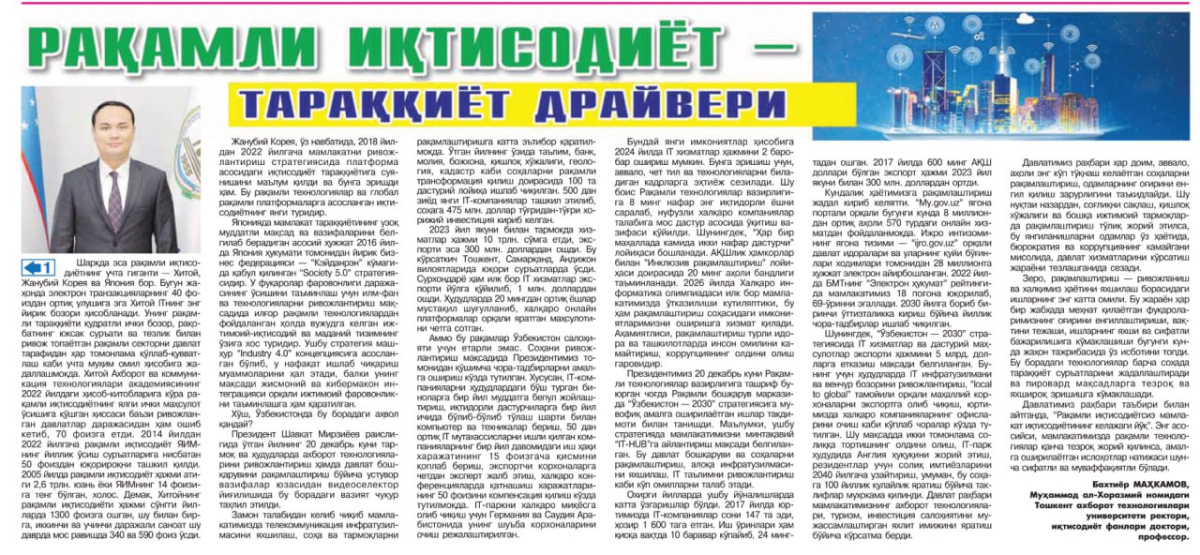 • B.Maxkamovning "Raqamli iqtisodiyot - taraqqiyot drayveri" nomli maqolasi chop etildi.