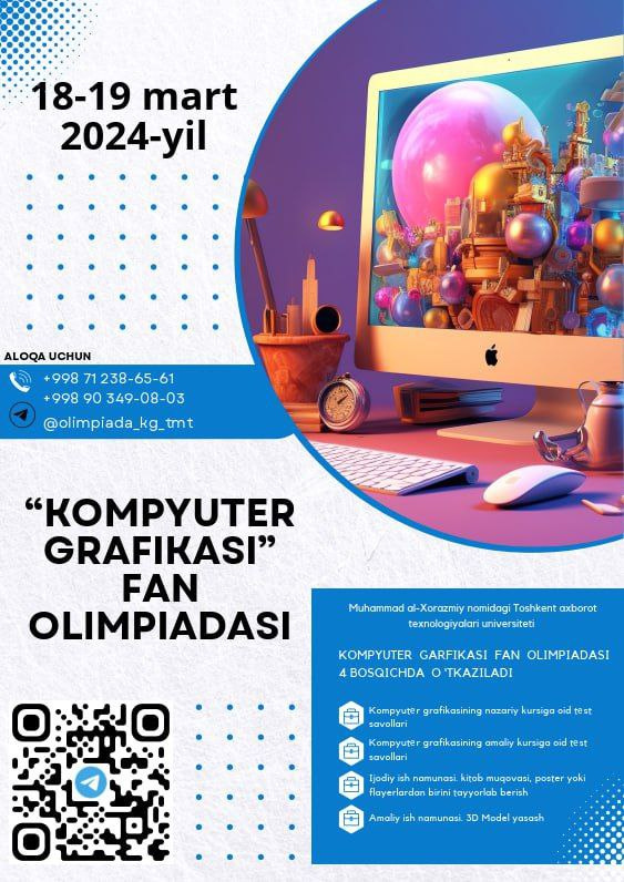 💻 Muhammad al-Xorazmiy nomidagi Toshkent axborot texnologiyalari universitetining Televizion texnologiyalar fakulteti Televizion va Media texnologiyalari kafedralarida Kompyuter grafikasi fani bo‘yicha olimpiada tashkil qilinadi.