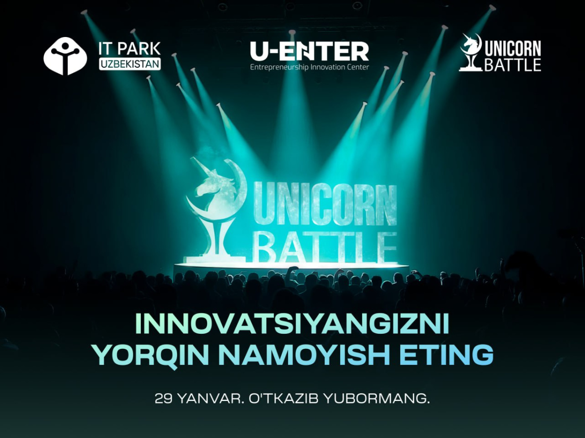 📅 2025-yil 29-yanvar kuni IT Park va U-Enter Unicorn Battle’ga mezbonlik qiladi. Bu global startap tanlovi bo‘lib, eng yaxshi g‘oyalarni namoyish etish uchun mo‘ljallangan.