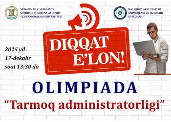 Muhammad al-Xorazmiy nomidagi Toshkent axborot texnologiyalari universiteti sizni bilim va amaliy ko‘nikmalaringizni sinovdan o‘tkazish imkonini beruvchi olimpiadaga taklif etadi.