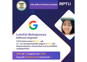 📣 Muhammad al-Xorazmiy nomidagi Toshkent axborot texnologiyalari universiteti Dasturiy injiniring fakulteti tomonidan 2024-yil 16-avgust kuni soat 19:00da Germaniyaning Kayzerslautern-Landau Universiteti sunʼiy intellekt tadqiqotchisi Latofat Bobojonova bilan hamkorlikda doktorantlar, mustaqil izlanuvchilar, magistrlar va talaba-yoshlar uchun “Veb qidiruv tizimini yaratish” mavzusida onlayn seminar o‘tkaziladi.