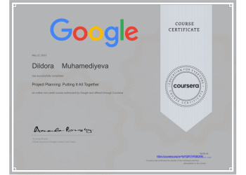 Axborot texnologiyalarining dasturiy taʻminoti” kafedrasi pofessori Muhamediyeva Dildora Kabilovna Googlening - Capstone: Applying Project Management in the Real world, Agile Project Management Project Execution: Running the project, Project planning: Putting It All Together kurslarini muvaffaqiyatli tugatib tegishli xalqaro sertifikatlariga ega bo'ldi.