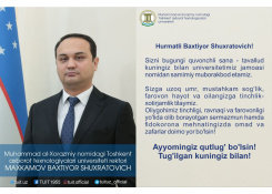 Sizni bugungi quvonchli sana - tavallud kuningiz bilan universitetimiz jamoasi nomidan samimiy muborakbod etamiz.