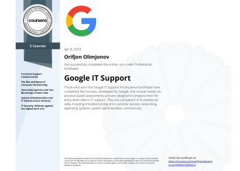“Google IT Support Certificate-2023” kursini muvaffaqiyatli tugat