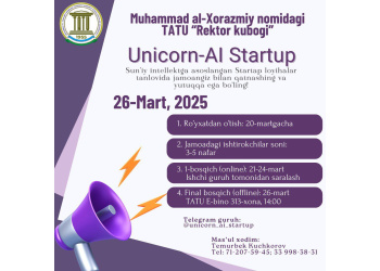 📣Diqqat! "Rektor kubogi" doirasida jamoaviy “UNICORN-AI" Startup” musobaqasi bo‘lib o‘tadi!