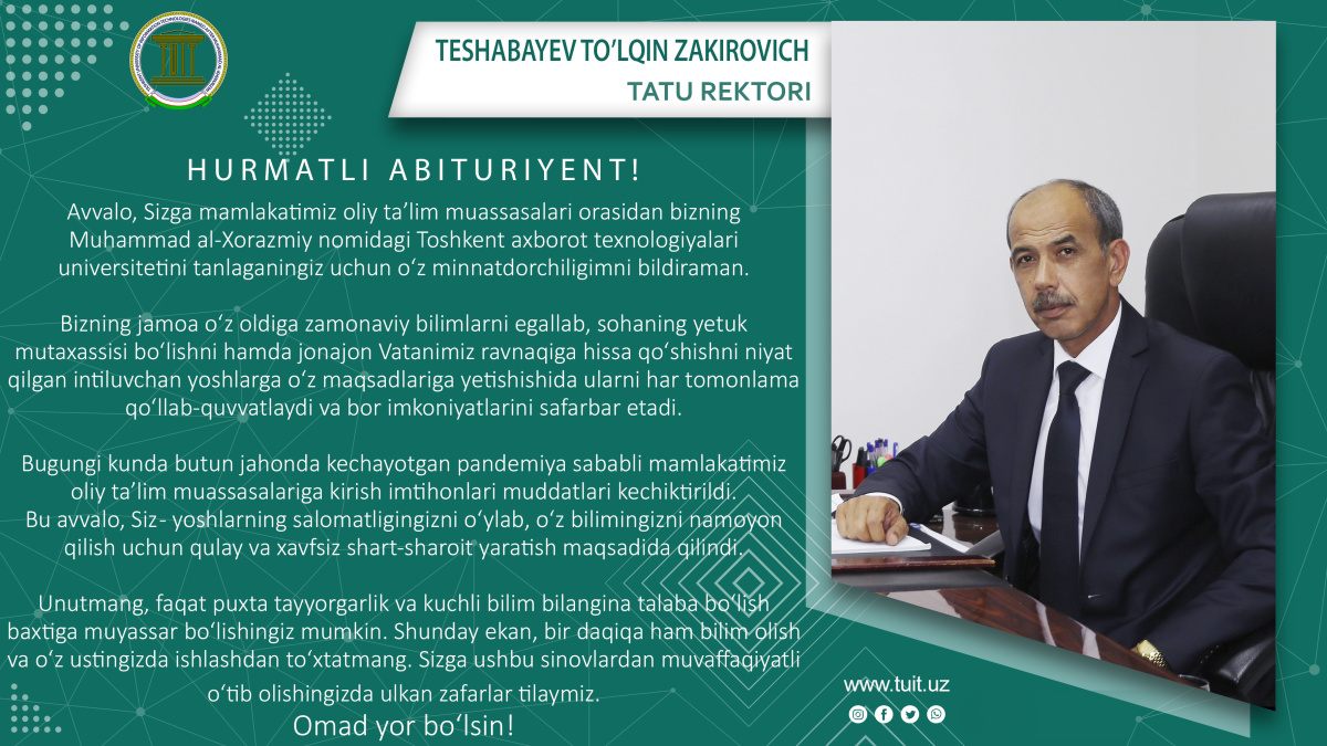 Прежде всего, позвольте выразить вам свою благодарность за то, что вы среди множества вузов нашей страны выбрали наш Ташкентский университет информационных технологий имени Мухаммада ал-Хоразмий.