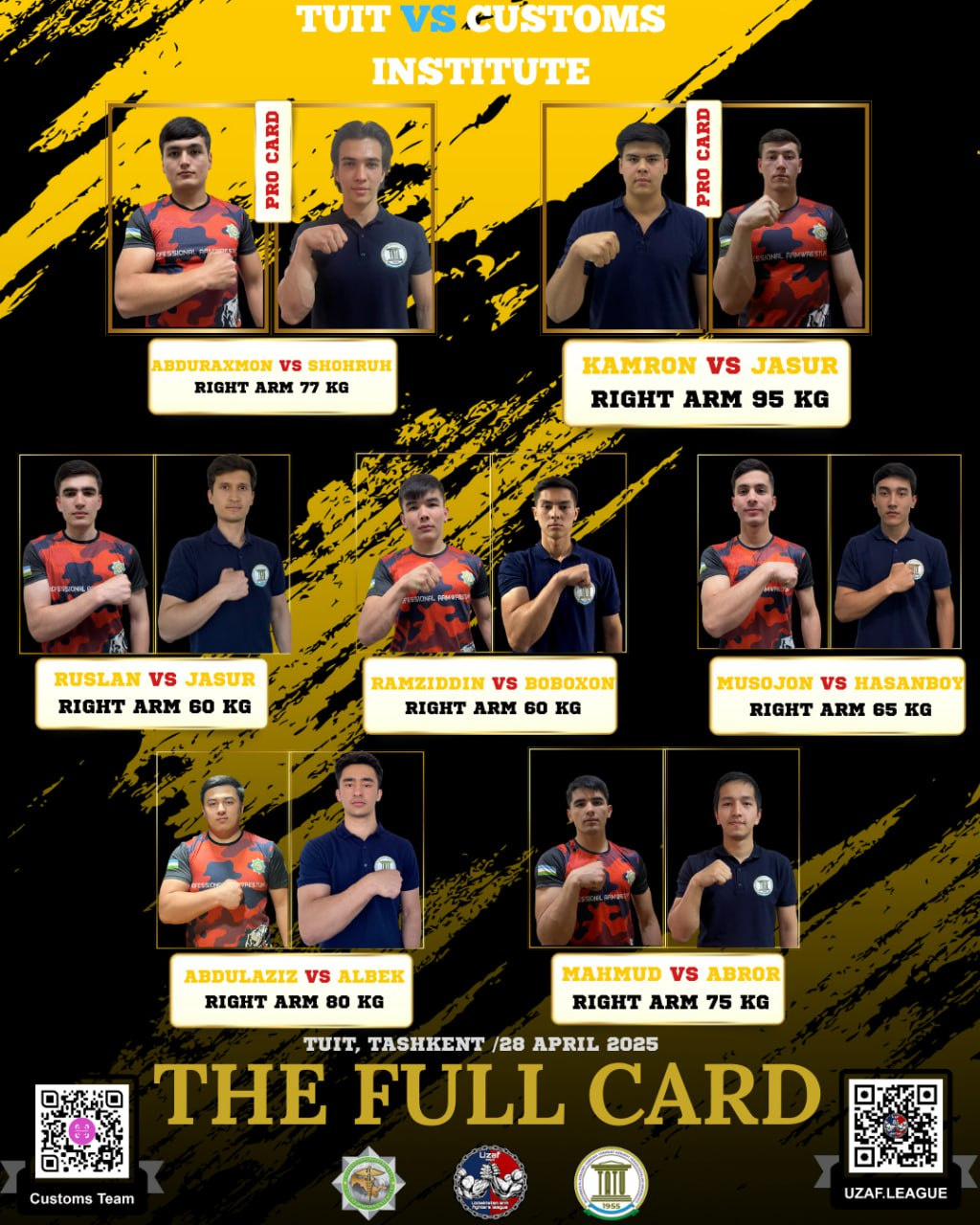 Сегодня, 28 апреля, в актовом зале корпуса «А» Ташкентского университета информационных технологий (ТУИТ) состоится соревнование по армрестлингу между командами спортсменов ТУИТ и Таможенного института (ТИ). Начало в 15:00.