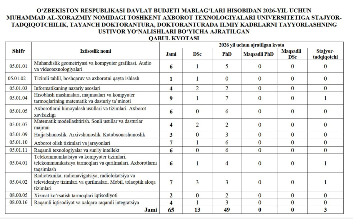 Ташкентский университет информационных технологий имени Мухаммада аль-Хорезми на 2026 год (https://t.me/ilmiy_darajali_kadrlar/1639) объявляет прием документов на базовую докторантуру (PhD), докторантуру (DSC) и стажировку по существующим специальностям!
