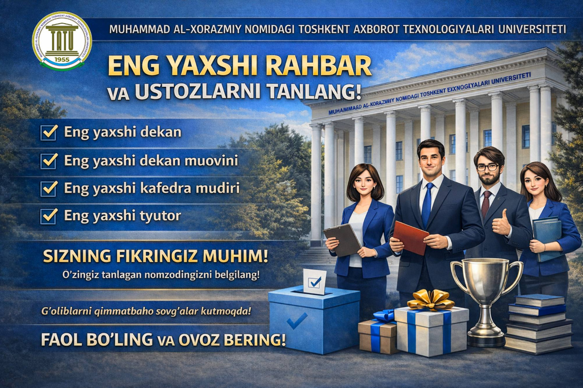 At Tashkent University of Information Technologies named after Muhammad al-Khwarizmi, competitions are announced in the following nominations to identify leaders and teachers who set a special example in the quality of education, management efficiency, and work with students: