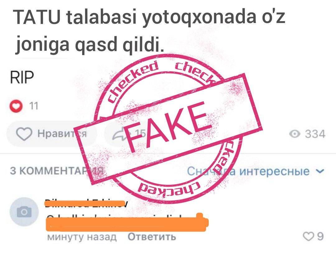 Фейковое сообщение о том, что "студент-ТУИТ покончил жизнь самоубийством в общежитии".