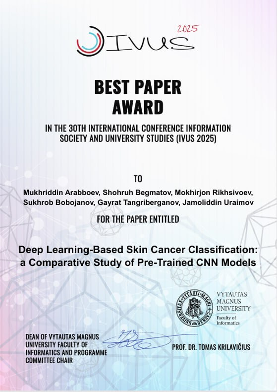 Научная статья под названием «Deep Learning-Based Skin Cancer Classification: A Comparative Study of Pre-Trained CNN Models» была представлена и удостоена премии «Лучшая статья».