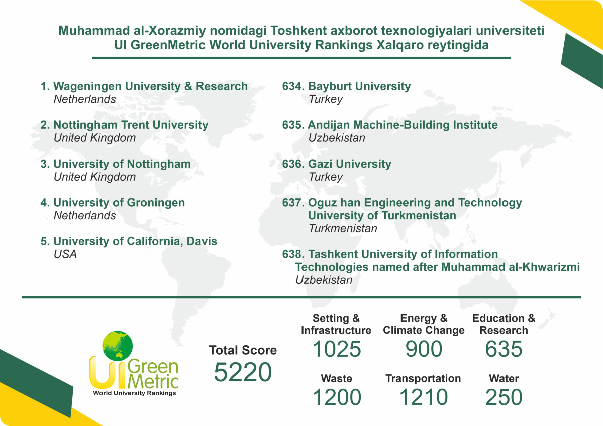 Ташкентский университет информационных технологий имени Мухаммада аль-Хорезми занял 638 место среди лучших университетов в международном рейтинге UI GreenMetric World University Rankings.
