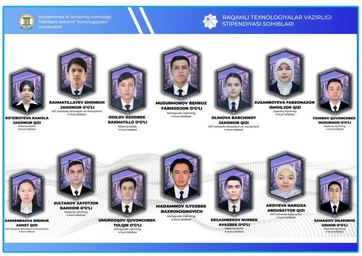 В соответствии с приказом Министерства цифровых технологий Республики Узбекистан № 3/235 от 28 октября 2025 года, учреждена стипендия Министерства цифровых технологий для одаренных студентов Ташкентского университета информационных технологий имени Мухаммада ал-Хорезми.