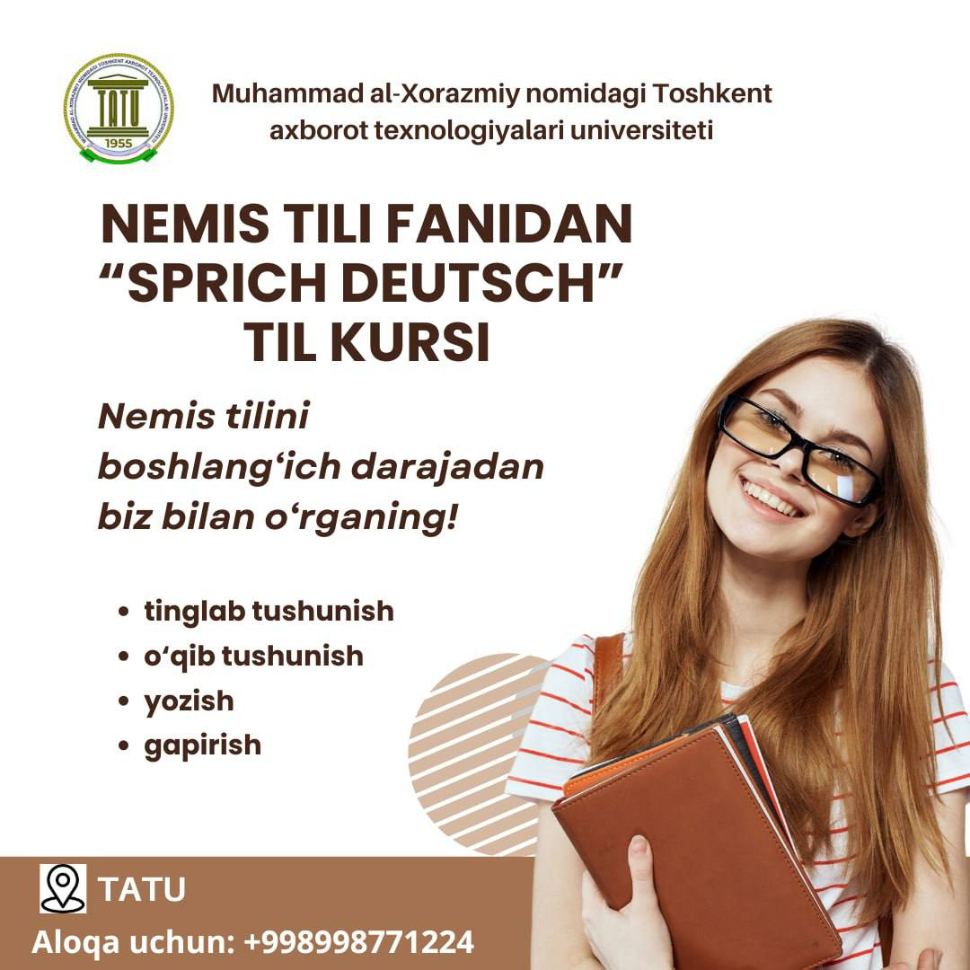 Открыт набор в группы на апрель для курсов немецкого языка при ТУИТ имени Мухаммада ал-Хорезми. Приглашаем студентов бакалавриата и магистратуры, докторантов, а также профессорско-преподавательский состав нашего университета.